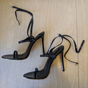 New with box. MITJV ankle wrap patent black almost 5 inch heels. Step out in style with these elegant black strappy heels. Perfect for any occasion, these shoes offer both comfort and sophistication. There's a little extra glue on one side, but it can probably be rubbed off. Please see last pics. There's also a pic of the clasps for these heels which isn't my fave but I've dealt with them before. China size 39, it US 8.
