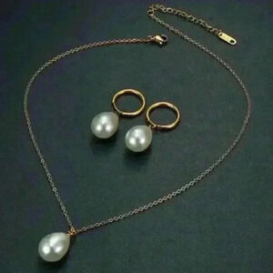 Pearl Drop Jewelry Set: Classic Teardrop Pearls on Gold-Tone Loops. Elegant Necklace and Earrings for a Timeless Look.
