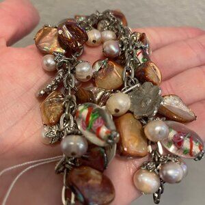 New, never worn, imported charm bracelet with pearls, shells and other beads.