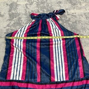 Elevate your summer style with this vibrant striped sleeveless top! Made from a lightweight, breathable material, this top features a high neckline and a charming bow detail on the right shoulder. The bold blue, pink, and white stripes create a fun and playful look that's perfect for a day out or a night on the town. Pair it with your favorite shorts, skirt, or jeans for a chic and effortless outfit.