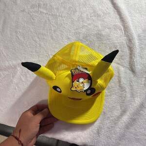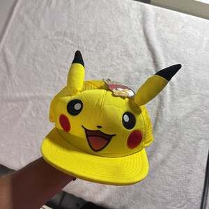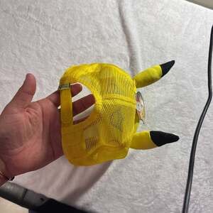 New with tags, this vibrant yellow Pikachu trucker hat features embroidered facial details and adorable 3D ears. The adjustable mesh back ensures a comfortable fit for all ages. Perfect for Pokemon fans and collectors!