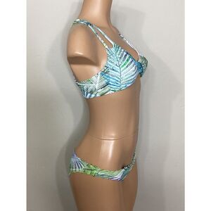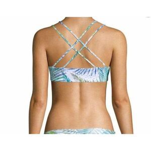 Beautiful tropical leaf print with colors of aqua, olive, purple, mint, and white. I love these colors! Utopia style top. Pull over. Crisscross strapping. No pads. Bottoms are reversible. Regularly $156