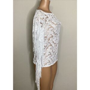 Beautiful white lace pull over cover-up with long fringe on the sides. I love this! For reference the manikin is a size 4. And can wear some size 6 bottoms.
