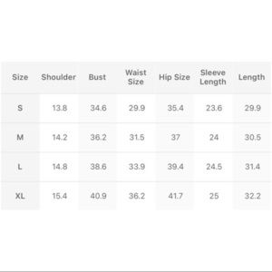 Bust: 31.5“, Waist: 23.6“, Hips: 34.6”