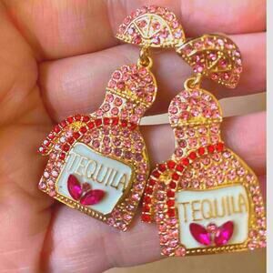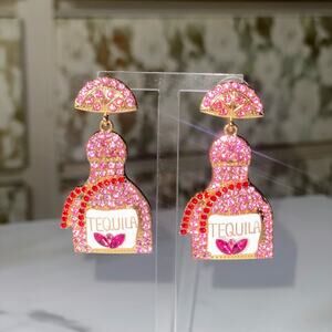 New Pink Rhinestone Tequila Bottle Dangle Earrings Jeweled Drop Barbiecore Gold