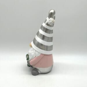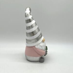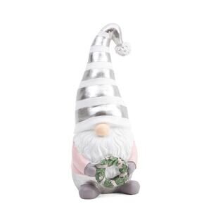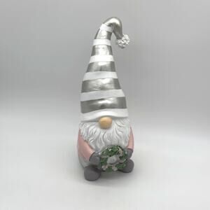 New pink and silver metallic resin Christmas gnome figure holding a wreath. Measures approx 14” h.