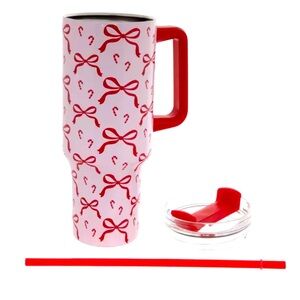 New! Pink Stainless Steel 40 oz Tumbler w/ Red Bows & Candy Canes w/ lid & straw