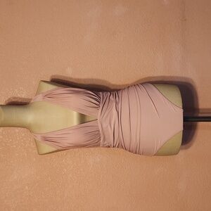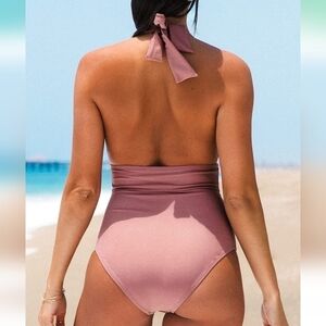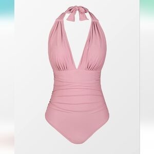 This is such a great classic looking swimsuit in a perfect shade of pink! The top is plunging and the straps tie behind the neck, halter style. The bra pads are removable. The tummy and hips have a super cute ruching detail. The butt has a good amount of coverage. True to size. New with tags!