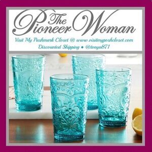 🦋 NWT The Pioneer Woman Amelia 16-Ounce Embossed Glass Tumblers, Set of 4, Teal Blue