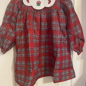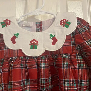 Red plaid long sleeve dress White scalloped collar with embroidered gifts and stockings Buttons in back Size 4 Smoke free home