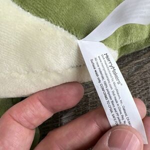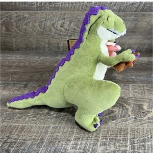 The product is a plush Tyrannosaurus Rex stuffed animal toy from MerryMakers, released in 2000. This small-sized (6-14 inches) T-Rex comes with a teddy bear and blanket, perfect for saying goodnight to young children. The green-colored plush is washable and is part of the character family of plush toys. Made in China, this cuddly toy is ideal for any occasion and sure to bring joy to both children and collectors.