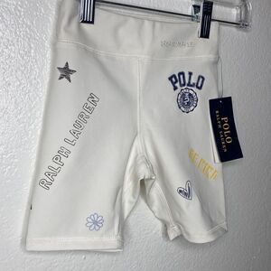 New with tags attached Polo by Ralph Lauren white elastic waist band bike shorts. Features polo logo and doodle motif throughout ( heart, flower , smiley face, peace sign etc) Fun and playful and perfect for summer. Size 5 Girls