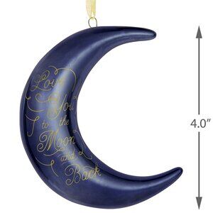Brand new in box and never opened, hard-to-find premium quality Hallmark Signature ornament made in 2022, this depicts a deep blue moon with gold decorative script reading "Love You to the Moon and Back" from Hallmark's fanciest ornament line with real premium porcelain, and the back of the box has a gift message prepared saying "I thank the stars for you." with a place to put the names of the recipient and giver so it's ready to present as a gift right away.