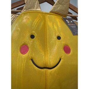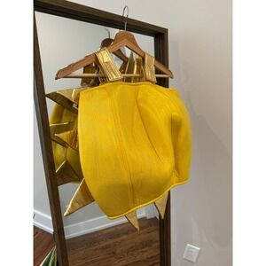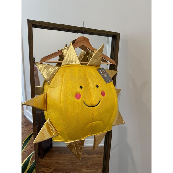Pottery Barn Kids smiling sun costume top. This adorable one-piece costume and accompanying headpiece brings a cheerful sun character to life. The playful design features a round, stuffed body with a smiling face, complete with rosy cheeks and bright eyes. Metallic gold sun rays extend from the sides and top, adding a radiant touch. The costume includes shoulder straps for easy wear and a separate sun-shaped hat.