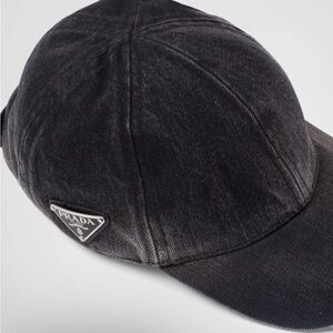 New Prada Black Denim Baseball Cap. Size: L. Unworn, brand new condition. Currently sold at Prada for $775. Internal tag with fabric composition was cut out, size and brand tags remain (pictured). This cap has an adjustable Velcro closure, but please also see the Prada sizing guide in the pictures.