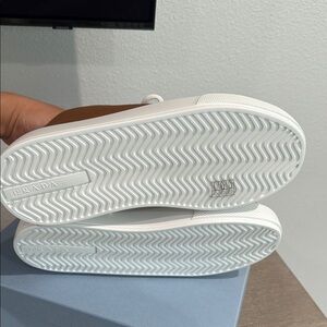 Experience luxury and style with Prada's brown and white sneakers, featuring a sleek suede upper and contrasting white rubber sole. These minimalist sneakers offer a versatile design, perfect for any casual occasion.