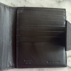 Black bifold with snap closure and plenty of room for cards. The exterior is nylon and the interior is the SOFTEST leather! You’ll see in one picture that that Prada purple cardboard stays are still inside the main interior flaps, so the shape is perfect. A few scratches on the box, but the wallet looks amazing.