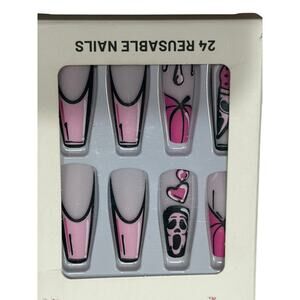 • Ghostface (Scream) pink & black design with hearts and French tips