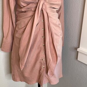 In a rose gold pink shade with a plunge neckline, tie wrap waist, ruched sides, and button front.