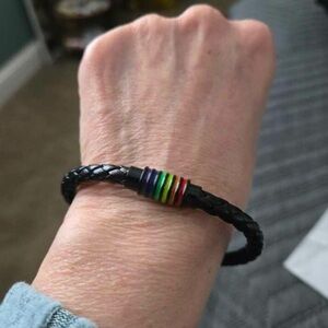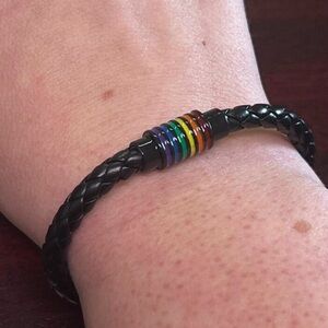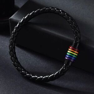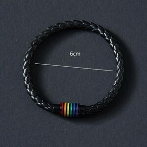 The New Pride LGBTQ+ Rainbow Striped Pattern Black Bracelet is a handmade round bracelet with a braided chain type. It features a multicolor rainbow striped pattern against a black background, making a bold statement in support of the LGBTQ+ community. The bracelet is designed as an Identity (ID) style accessory, ideal for expressing love and pride for diverse identities. It is not signed by any specific artist or brand, and it does not include any secondary