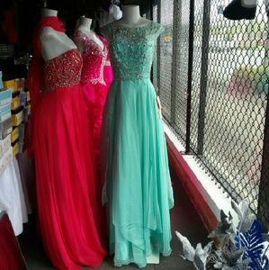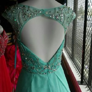 Size S, With beautiful embellishments at the top, it is full length. This dress actually is a look a like to a Sherri Hill one. I also have in size L and in Medium I coral