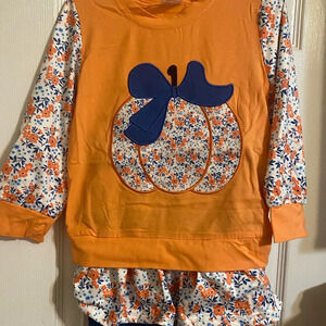New Pumpkin Outfit Long sleeve orange top with pumpkin appliqué on front Floral ruffle hem Matching blue elastic waist leggings Smoke free home
