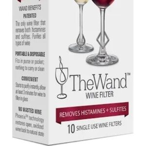 New PureWine Wand Purifier Filter Sticks are for wine lovers who want to savor every glass. Each wand helps remove Histamines and Sulfites, Reduces Wine Allergies and Helps Eliminates Headaches. Each Wand aerates and purifies up to 3 glasses of wine. The Wand works on all red, white and sparkling wines while enhancing flavor, aroma and color, ensuring a smoother, more enjoyable wine experience. Restores opened, oxidized wine back to its natural taste. Each Filter Stick removes the stuff that doesn't belong. Each Wand has a twist-off wine charm so you can track your glass in style.