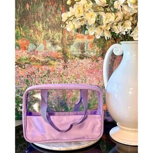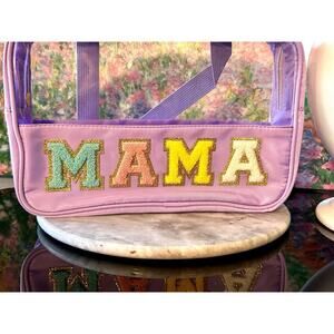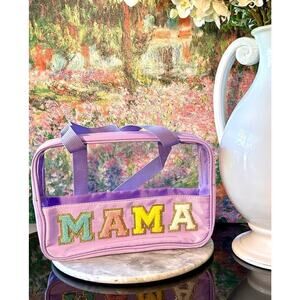 New lavender and clear "MAMA" zipper pouch bag with handles and colorful letter patches. Adorable Stoney Clover look-a-like. Very cute and great for organization, snacks, cosmetics, toiletries, electronics, baby/toddler needs, and etc. Works well for daily use or for travel. Transparent sides help you locate what you need quickly. Double handles for easy carrying or hanging on stroller. Can be used over and over again. Cute accessory for adults and kids alike! Bag is approximately 11inW x 7inH x 3inD.