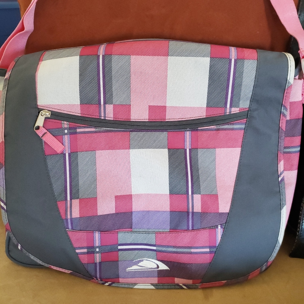 New, large quicksilver/Roxy computer bag - satchel that is perfect for any chic starting school too! Pretty plaid colors of pinks,greys,purples and white with an adjustable strap. Many pockets and zippers for your stuff. NWOT but never used.