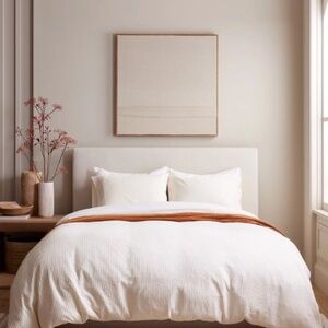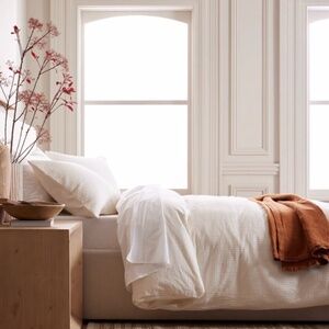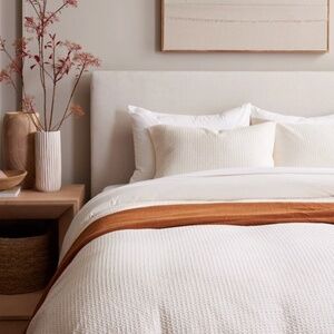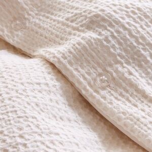 New with tag. Quince Organic Luxe Waffle Honeycomb Queen Duvet Cover in Undyed. This beautifully textured waffle duvet cover is woven from super soft 100% organic cotton. Lightweight and breathable, it features a traditional honeycomb design on the front and a classic 400 thread count percale on the reverse side. Handcrafted for aesthetic ease and touchable comfort. Organic cotton is made without harmful toxins like pesticides or insecticides, making it safer for the farmers who harvest it, the consumers who use it, and the environment. At the end of the day, it's the perfect waffle duvet cover. 100% organic waffle weave cotton; reverses to 100% organic 400TC solid cotton percale. Button closure and corner ties to hold comforter in place. Excellent clean new with tag condition.