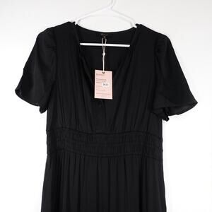 Embrace bohemian style with this stunning Quince silk maxi dress in size small. The dress features a flattering V-neckline and puff sleeves, with an empire waist that enhances your curves. The layered accents and satin fabric give the dress a luxurious touch, perfect for any occasion from travel to parties or casual outings.