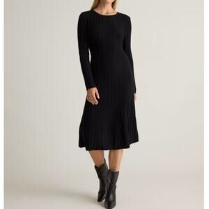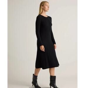This is a stylish and versatile Quince women's sweater dress made from Mongolian cashmere in a wide ribbed knit fabric, perfect for the winter, fall, and spring seasons. The dress features a sleeved design with a crew neck neckline and a midi length, making it suitable for various occasions such as parties, casual outings, or business events. The dress comes in a classic black color, and is recommended to be hand washed only, maintaining its quality and softness.