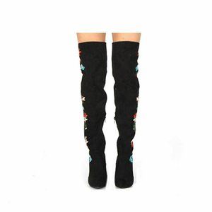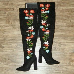 New Qupid Boots 6 OTK Over Knee Heel Black Faux Suede Embroidered Flowers