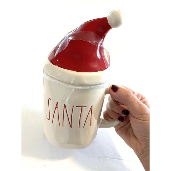 New RAE DUNN Christmas “SANTA" White Mug With Santa Hat Topper Red Letters. Condition is "New".