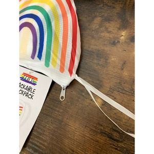 New and unused white packable backpack with a rainbow print. Folds into a wristlet pouch.