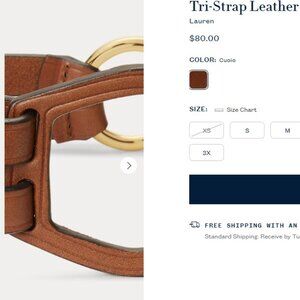 Sophisticated style from the current Lauren Ralph Lauren collection. Distinguished by a unique tri-strap silhouette, this belt is elevated by full-grain leather and polished gold-tone hardware for a modern look. It’s an affordable version of their $650 belt in the higher line (see gallery photo). RLL embossing on the front gold buckle. The leather belt is 1.125” wide, the gold parts are 1.5” tall and the center leather buckle is 2.75” tall. It measures apx 28.5” around on the middle holes and can be made larger and smaller. The tag is pinned on as shown.