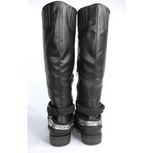 Put some rough riding into your look this season! Faux-leather upper. Side-zip and pull-on construction. Decorative strap at ankle. Round-toe. Synthetic lining. Lightly padded footbed. Man-made outsole. Stacked heel.