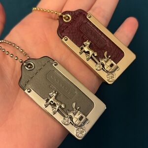 Pair of Coach hangtags in maroon and gray. Features gold-tone and silver hardware with horse and carriage logo!