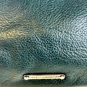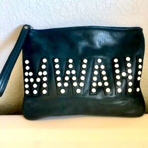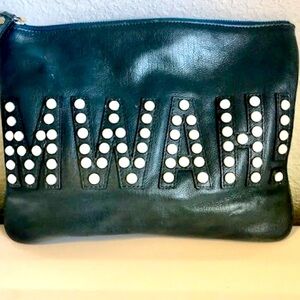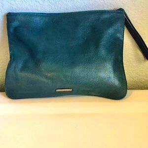 New REBECCA MINKOFF Pearl 'MWAH!' Bag Teal Leather Clutch Wristlet 11x8 MSRP$175