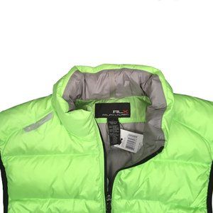This is a brand new down vest from RLX by Ralph Lauren! It retails for $198, it's bright yellowish green with silver RLX printed on the shoulder and back of neck. Here are the features: