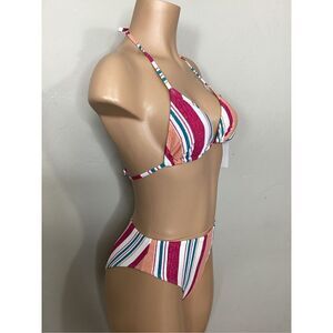 New. Roxy striped bikini set. Multicolored stripes in a vertical pattern. Sliding triangle top with soft removable pads. Ties at neck and back for easy adjustment. Logo on front.