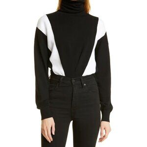 The RtA Isla bodysuit sweater in black white is a cotton knit turtleneck sweater with contrast intarsia white stripes and center pleat in V formation.