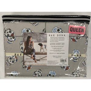 New Rae Dunn 4 Piece Queen Sheet Set Gray with Halloween Sugar Skull Print