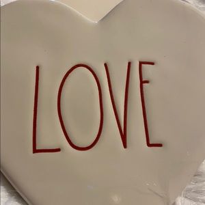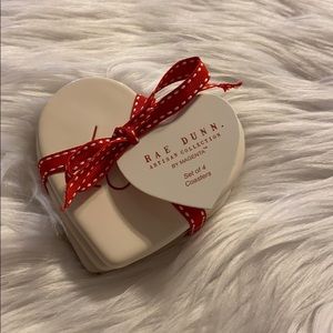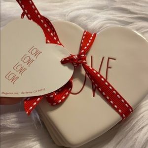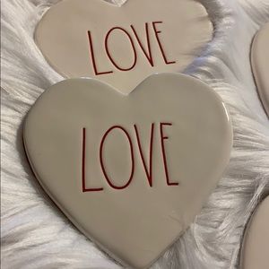 Set of Four heart-shaped ceramic coasters with LOVE in red lettering
