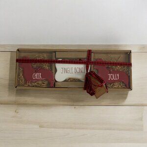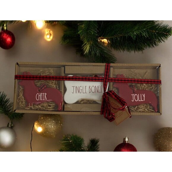 New Rae Dunn Set Of 3 Dog Ornaments Cheer, Jingle Bones, Jolly Red White NEW