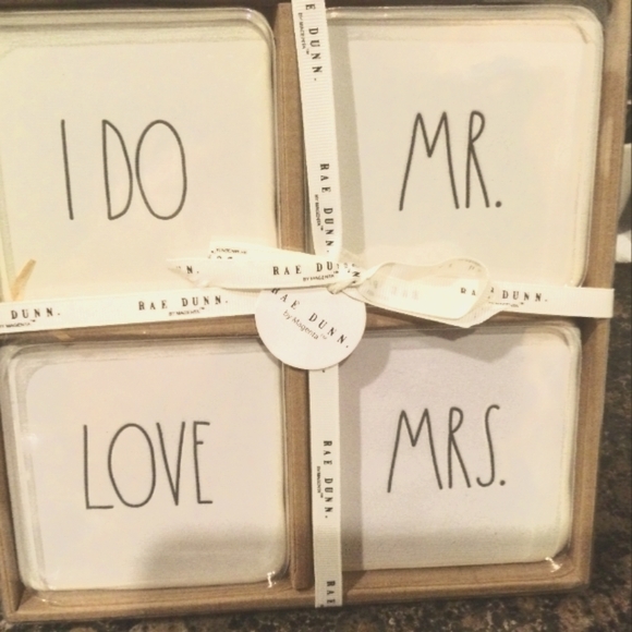 Brand new never used in original packaging Rae Dunn coasters absolutely beautiful. Black and white excellent for gift-giving especially with the bow. Excellent gift for newlyweds