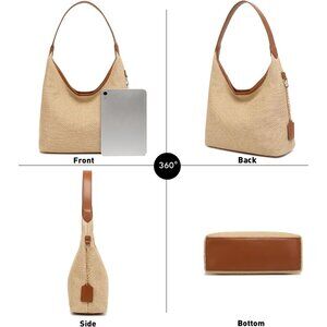 This stylish straw shoulder bag is made of high-quality eco-friendly material, featuring a unique fine weaving process that ensures durability and a soft, comfortable feel. Its foldable design makes it easy to pack for travel. Medium-sized with compartments — enough to hold your essentials like iPad, sunglasses, keys, phone, wallet, and cosmetics. Two main compartments, two interior zip pockets, and an interior slot help keep everything organized. Size is similar to the Coach Brooklyn 28, but just a tad larger (if you know, you know!) :)