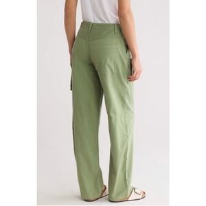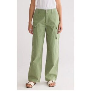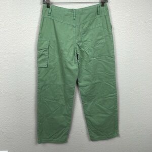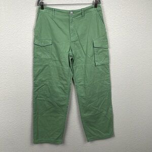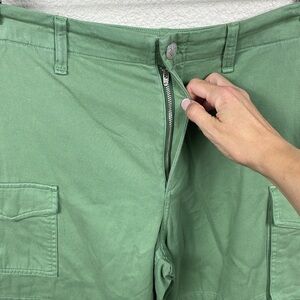 Features a utility cargo style with flap pockets, button and zipper closure, belt loops, straight leg silhouette. Light green color, durable and structured feel, great for casual or streetwear styling