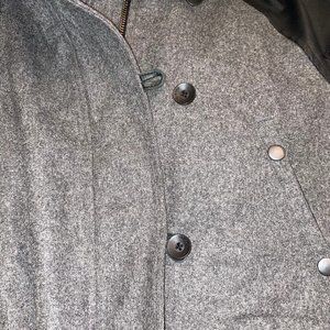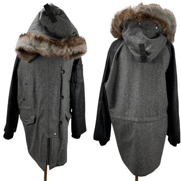 Amazing Rag & Bone Parka Coat. Mixed fabric including wool, canvas and leather. Detachable (faux?) fur trim. Zip, snap and button front closures. Snap pockets. Quilted lining. Hidden drawstring waist. Hidden knit cuffs.
