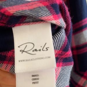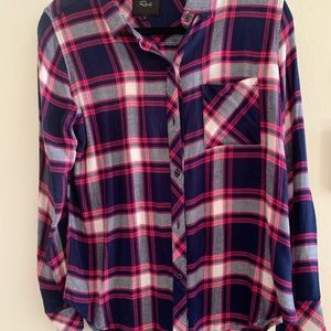 Brand new, never worn Rails button down. High quality thin plaid soft material in feminine fuschia/navy design. I removed the tag because I thought I might keep, but changed my mind.